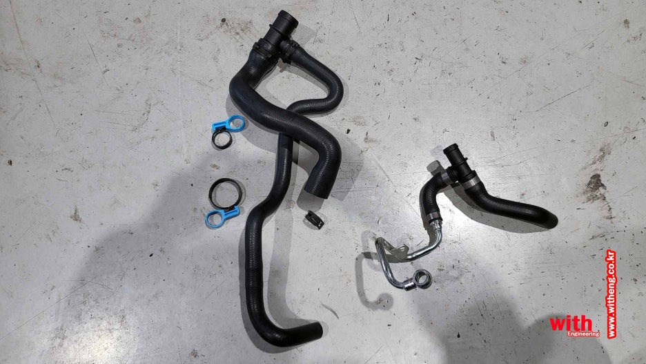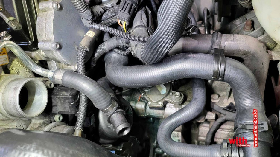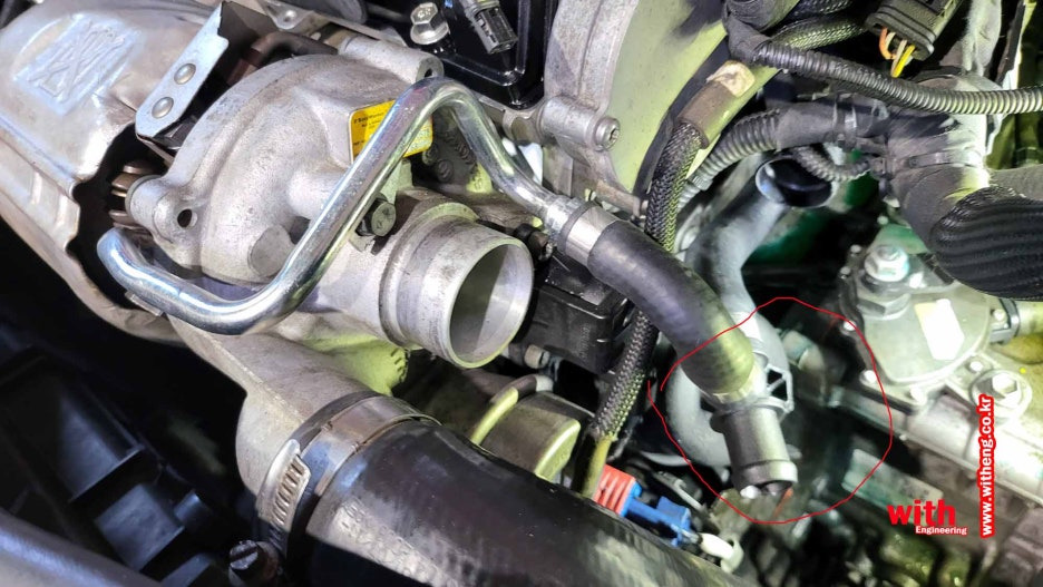 서모스탯으로 가는 냉각수 호스와 터보를 들어가는