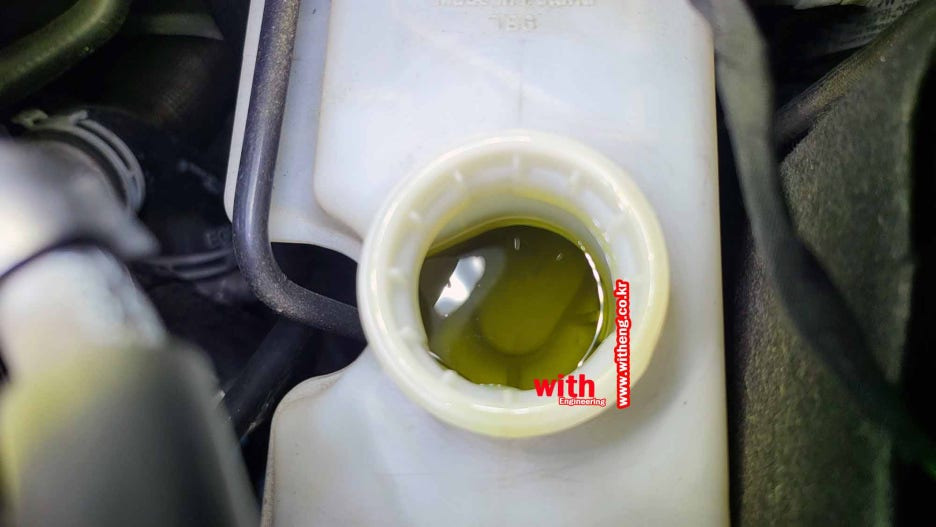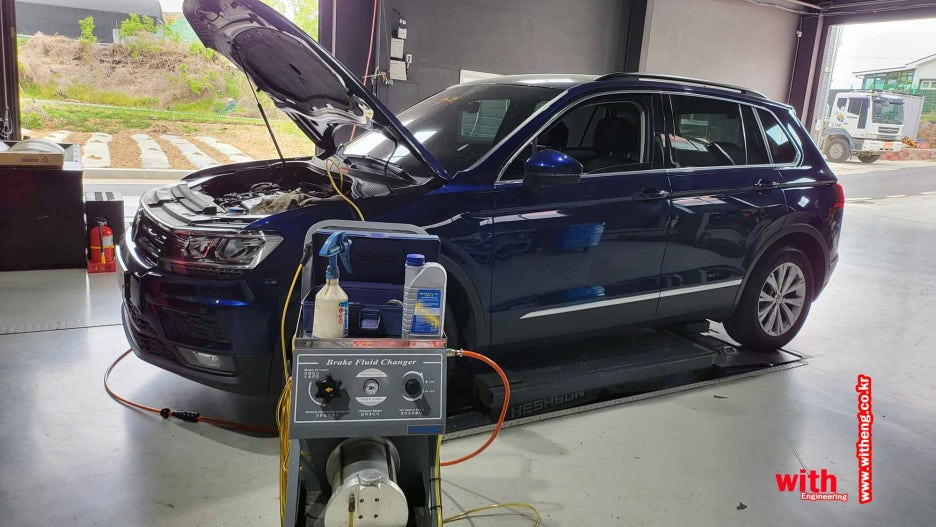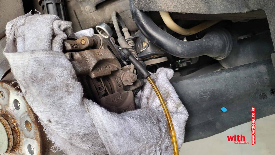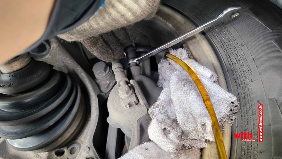 모든 바퀴에서 폐유 브레이크액 배출과 신품 브레이크액 주입하였습니다.