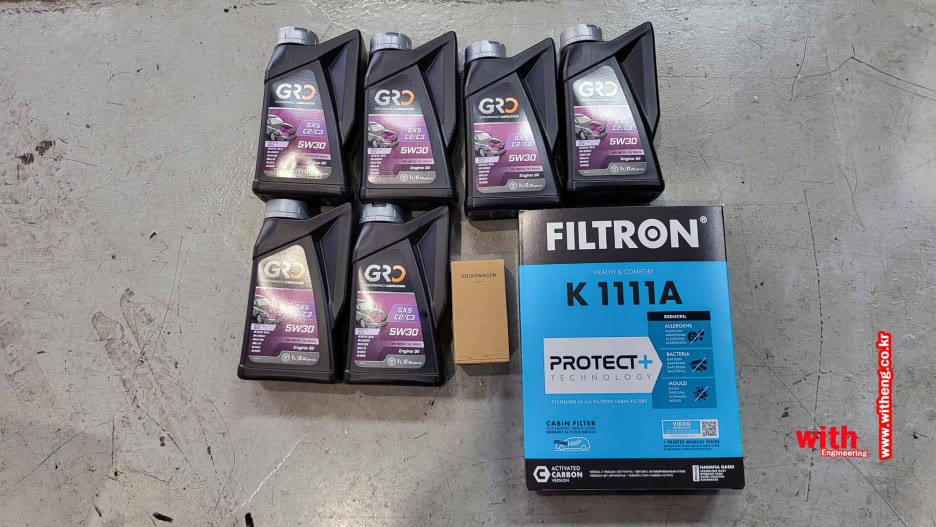 폭스바겐 파사트에 교환 준비된 엔진오일과 정품 오일필터와 에어컨 필터입니다.