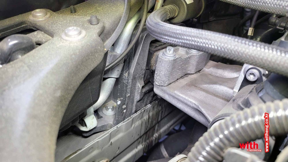 파손된 엔진 마운트가 보입니다. 검은색이 흘러내렸죠